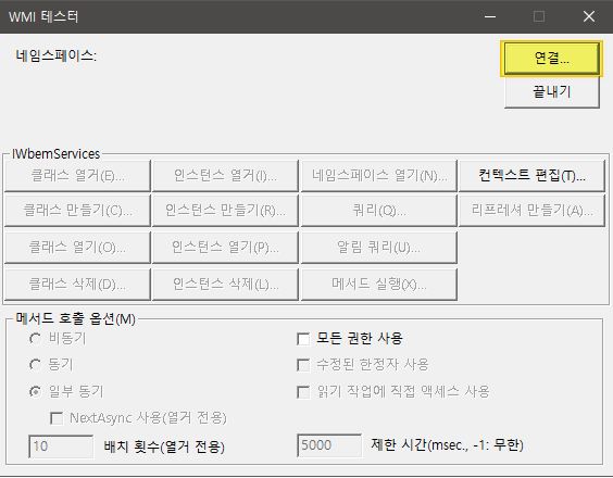 EventID:5612 Windows Management Instrumentation has stopped WMIPRVSE.EXE because a quota reached a warning value. 오류 발생 시 조치 방법 1. 시작 > 실행에서 WBEMTEST 입력 2. 연결 3. 네임스페이스에 'root' 입력 후 연결 4. 인스턴스열거 클릭 5. 슈퍼클래스 이름에 아래 클래스명 입력 후 확인 __ProviderHostQuotaConfiguration 6. 쿼리 결과에 나온 값을 더블클릭 7. HandlesPerHost 선택 후 속성편진(값이 4096인점 확인) 8. 아래 값으로 변경 8192 (0x2000) 9. HandlesPerHost 값이 8192로 변경된 점 확인 후 개체저장 버튼 클릭..